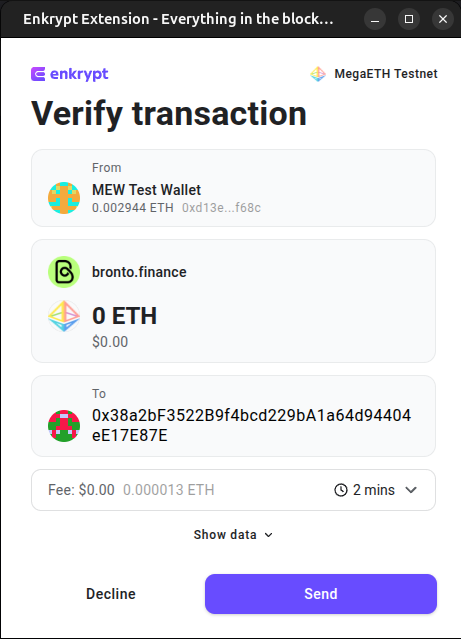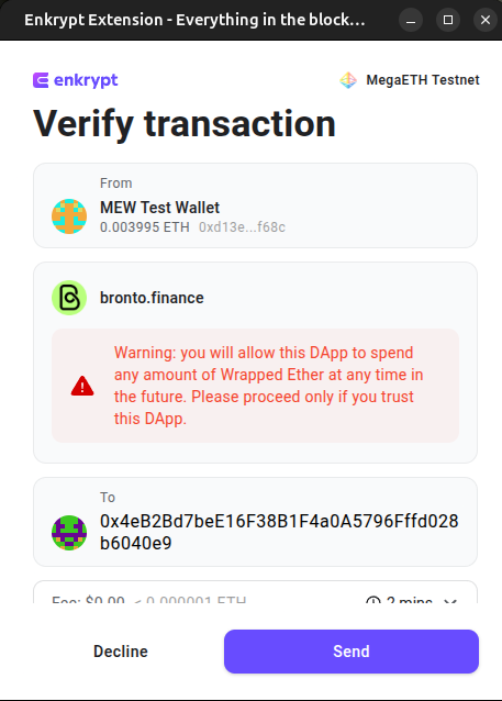 We will need to approve the dApp to use our WETH. Confirm the transaction on the Enkrypt pop up by clicking ‘Send’.