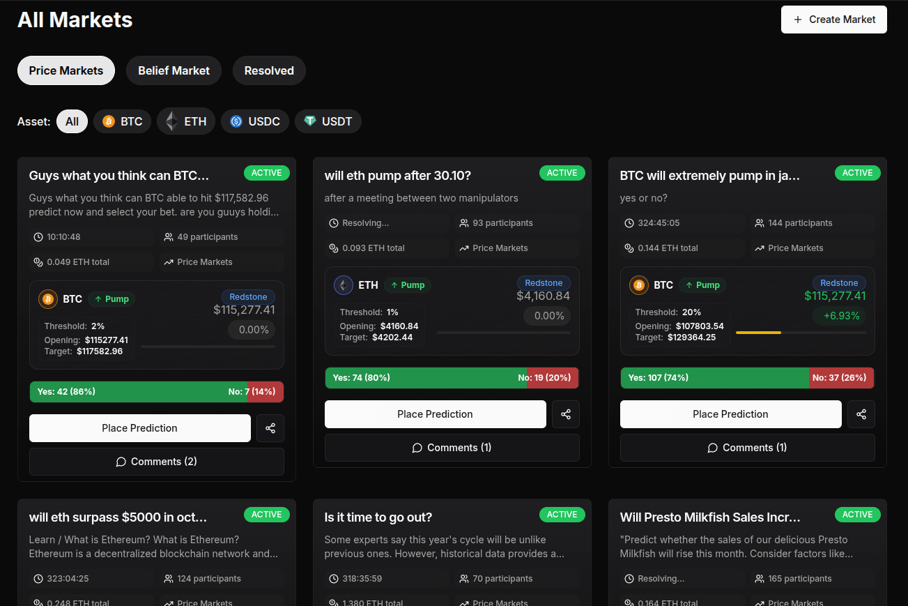 In the navigation menu, select ‘Markets’ to view the current available prediction markets.