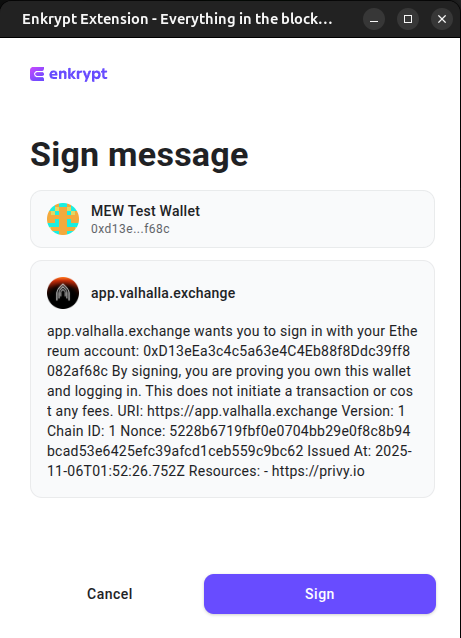 Next, you will need to sign a message to prove you own the wallet you are connecting with. Click ‘Sign’ on the Enkrypt pop up to sign the message.