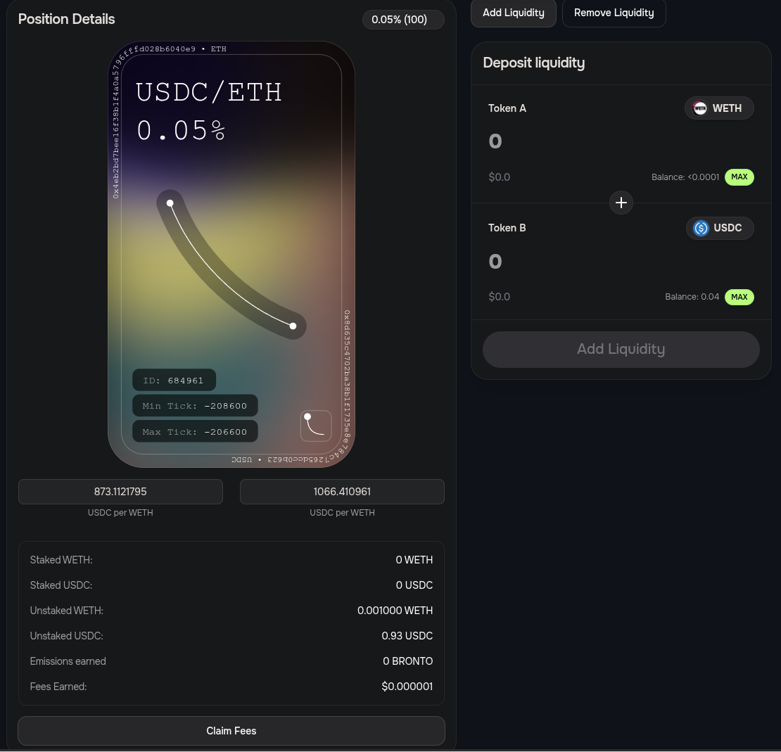 Here you can add more liquidity, remove all or some of your liquidity or claim the fees earned so far.
