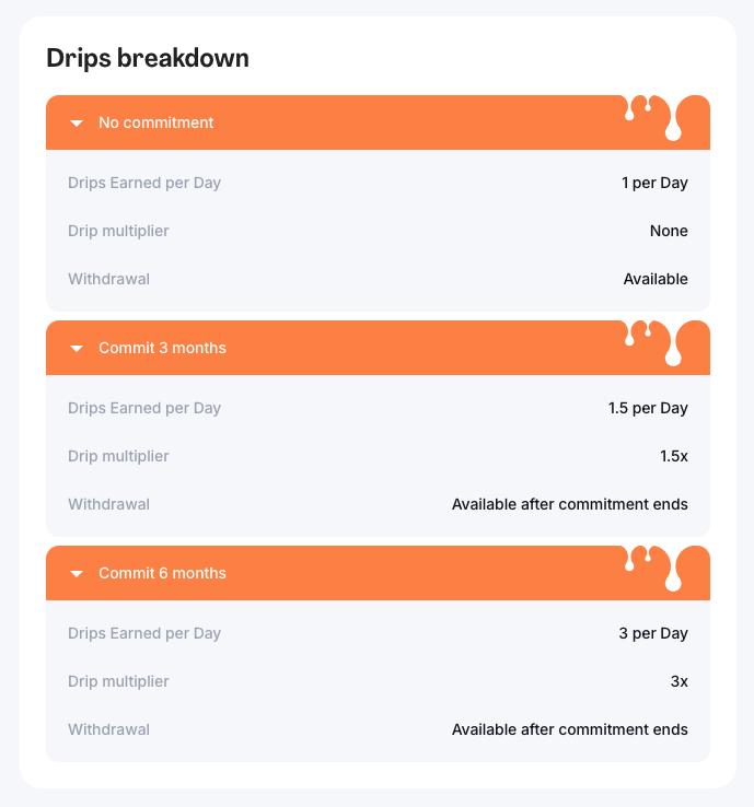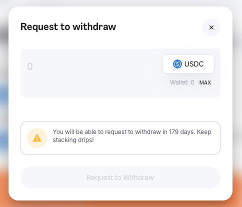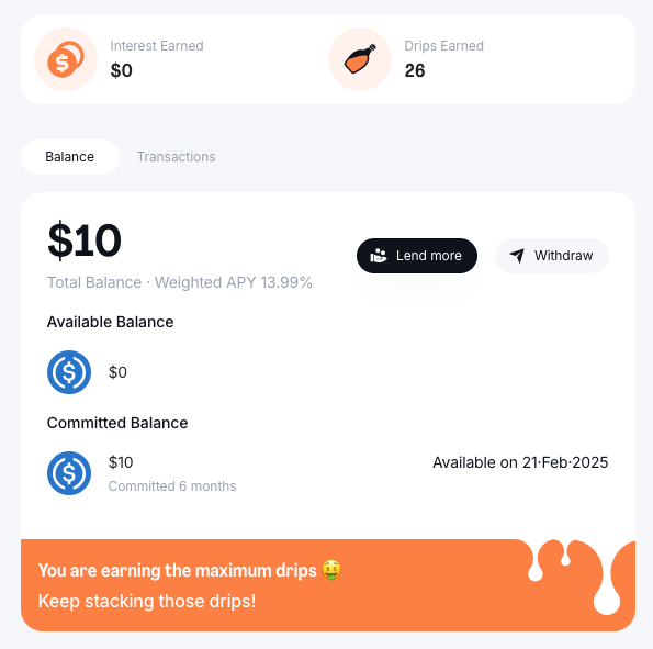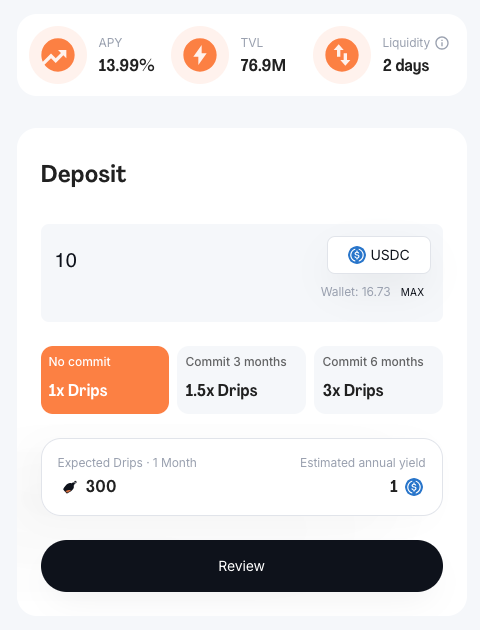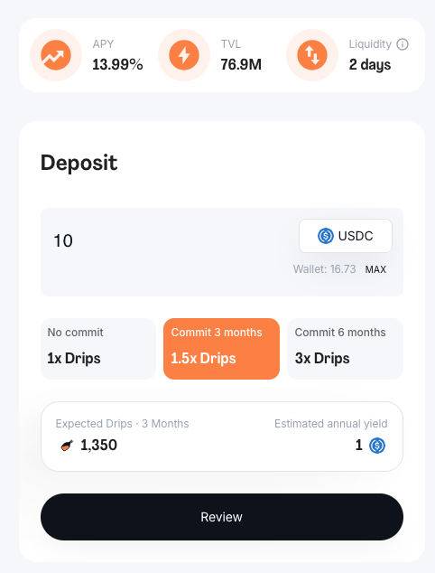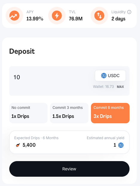Enter in how much you want to deposit and for how long you're committing the funds for. The longer you lock-up your funds, the more "Drips" you earn.