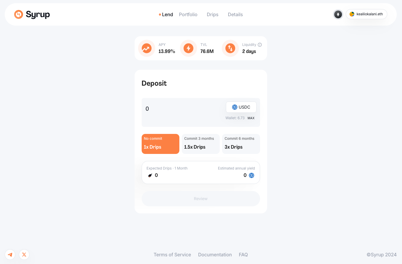 "Drips" is Syrup Finance's unique points system. The more Drips you earn, the bigger your airdrop allocation will be! Once you've decided how long to lockup your $USDC for, click on "Review".
