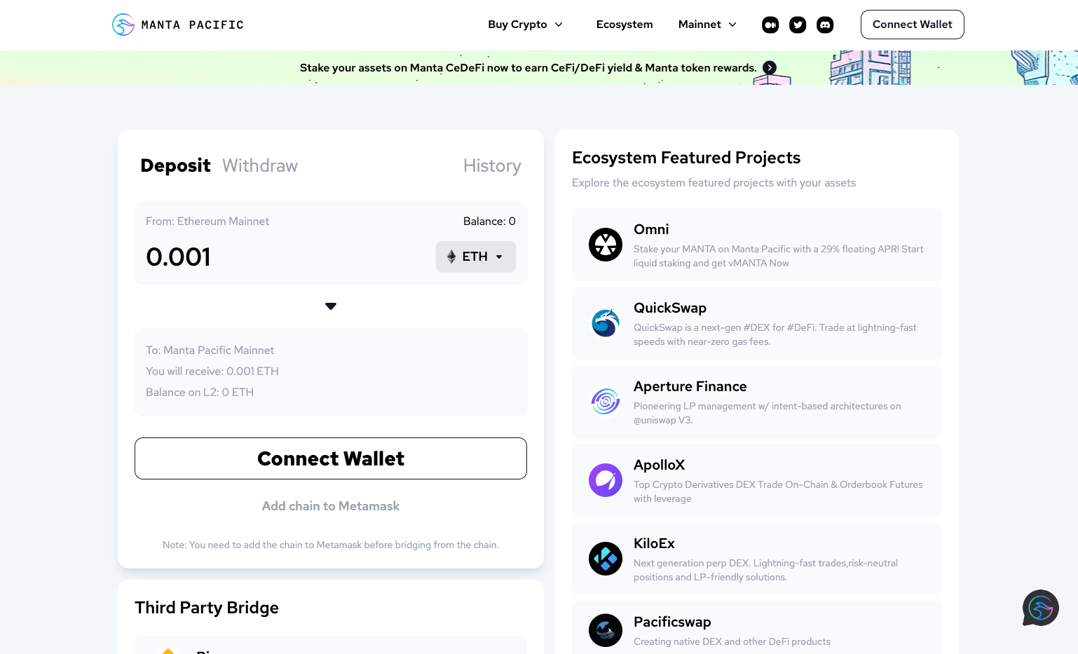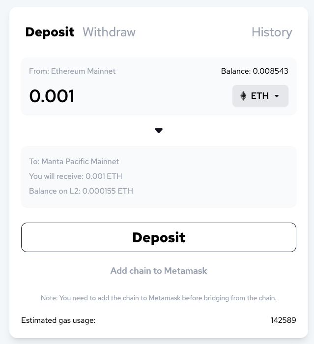 Layer 2s and scalability networks like Manta Pacific are compatible with Ethereum, but you can't just send assets from Ethereum to Manta Pacific in a regular transaction. The way to transfer assets between Ethereum and Layer 2s is through applications called bridges.