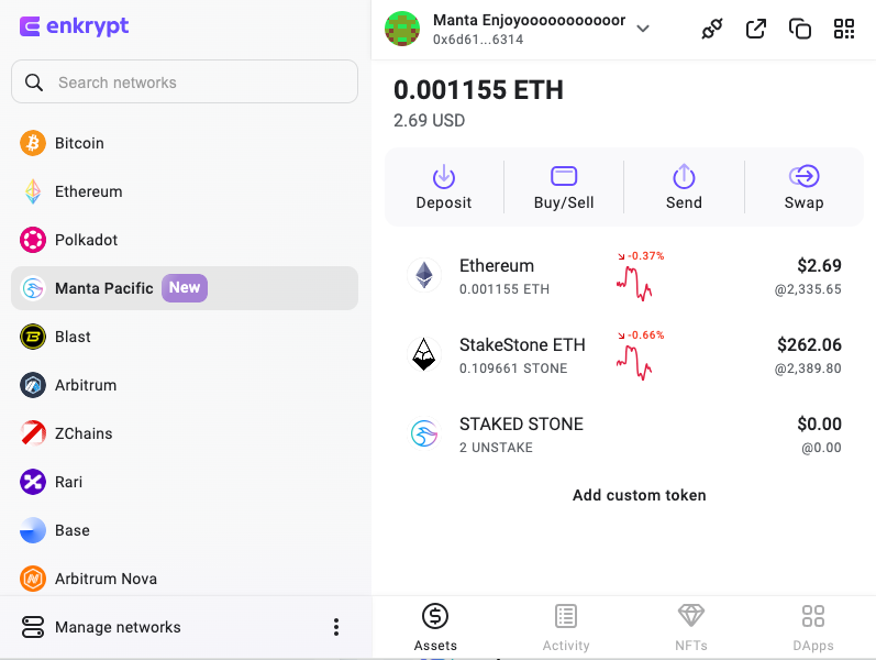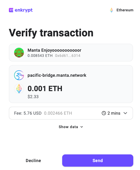 Enkrypt is a multichain, non-custodial, and open-source web3 browser wallet built by the team behind MEW (MyEtherWallet). With Enkrypt, users and developers can generate accounts, manage tokens and NFTs, and interact with DApps on Manta Pacific, as well as Substrate and Bitcoin chains. Follow the instructions in this guide in order to bridge to Manta Pacific!