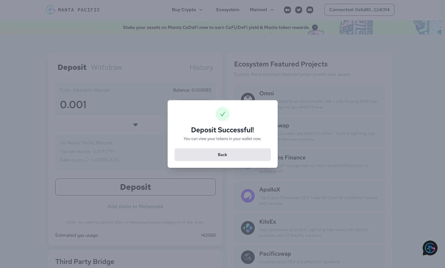 When you're ready, click on "Deposit" to initiate the bridge.