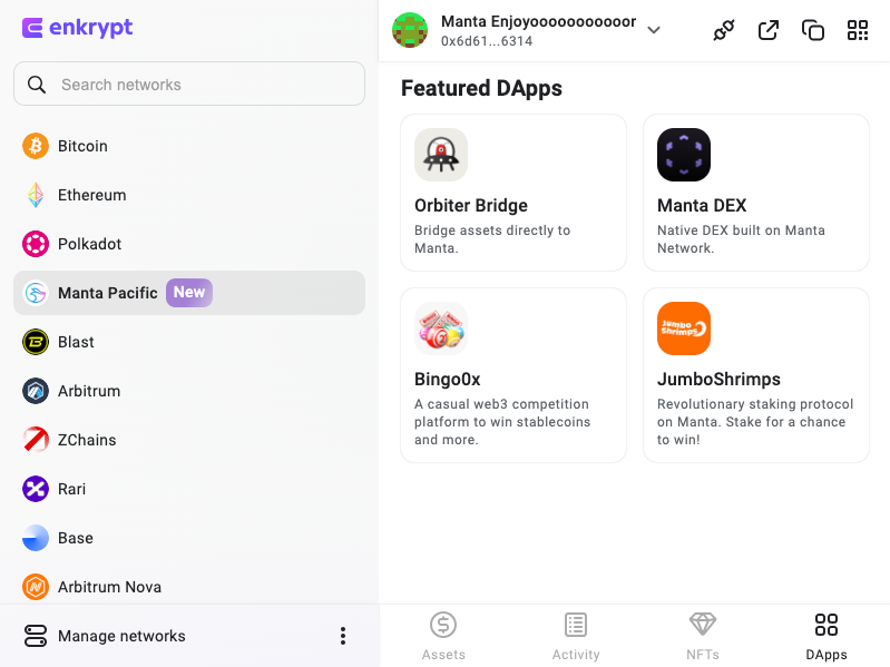 By clicking on "DApps" on the bottom right of your wallet, you'll see some featured Manta Pacific DApps.