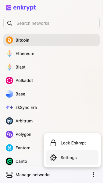 Open up Enkrypt. Click on the 3 dots on the bottom left side of the wallet.