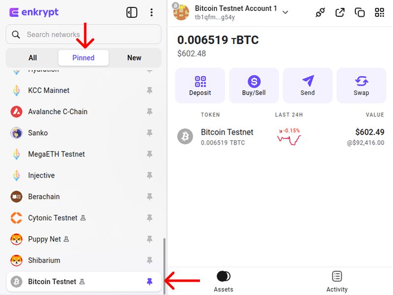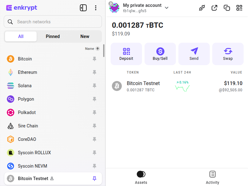 Once your transaction is confirmed, you can see your Test Bitcoin in your Enkrypt wallet.