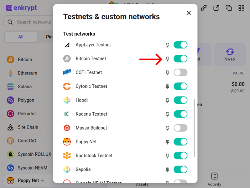 Scroll through the list or search using the search bar for Bitcoin Testnet then enable the toggle and click the Pin icon.