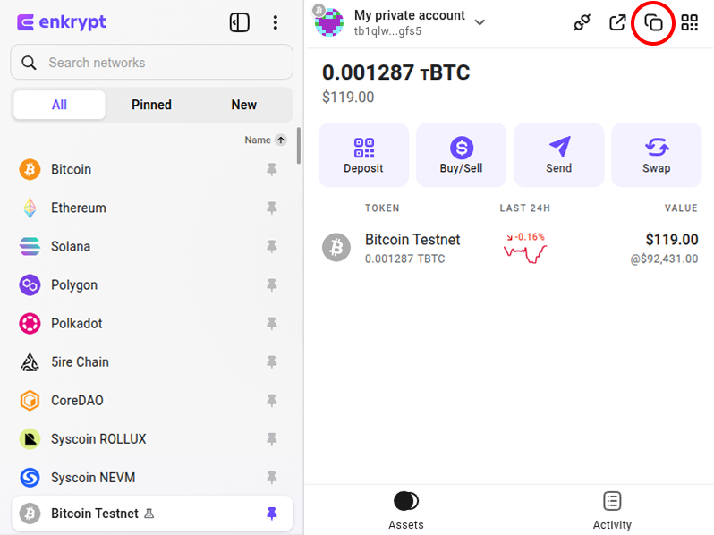 Copy your Bitcoin Testnet wallet address from Enkrypt by clicking the copy icon.