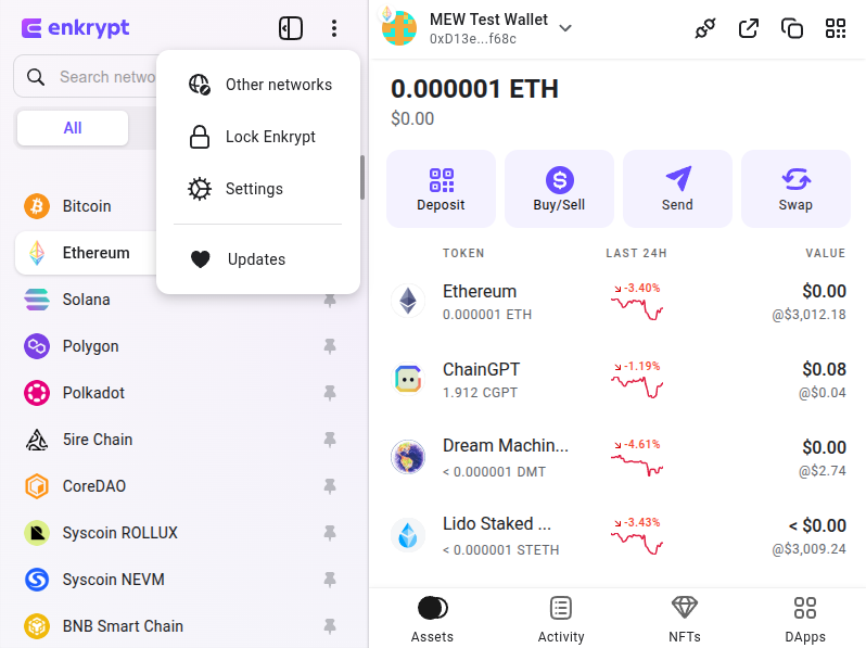 Click the 3 dots icon on the top of the Enkrypt wallet.