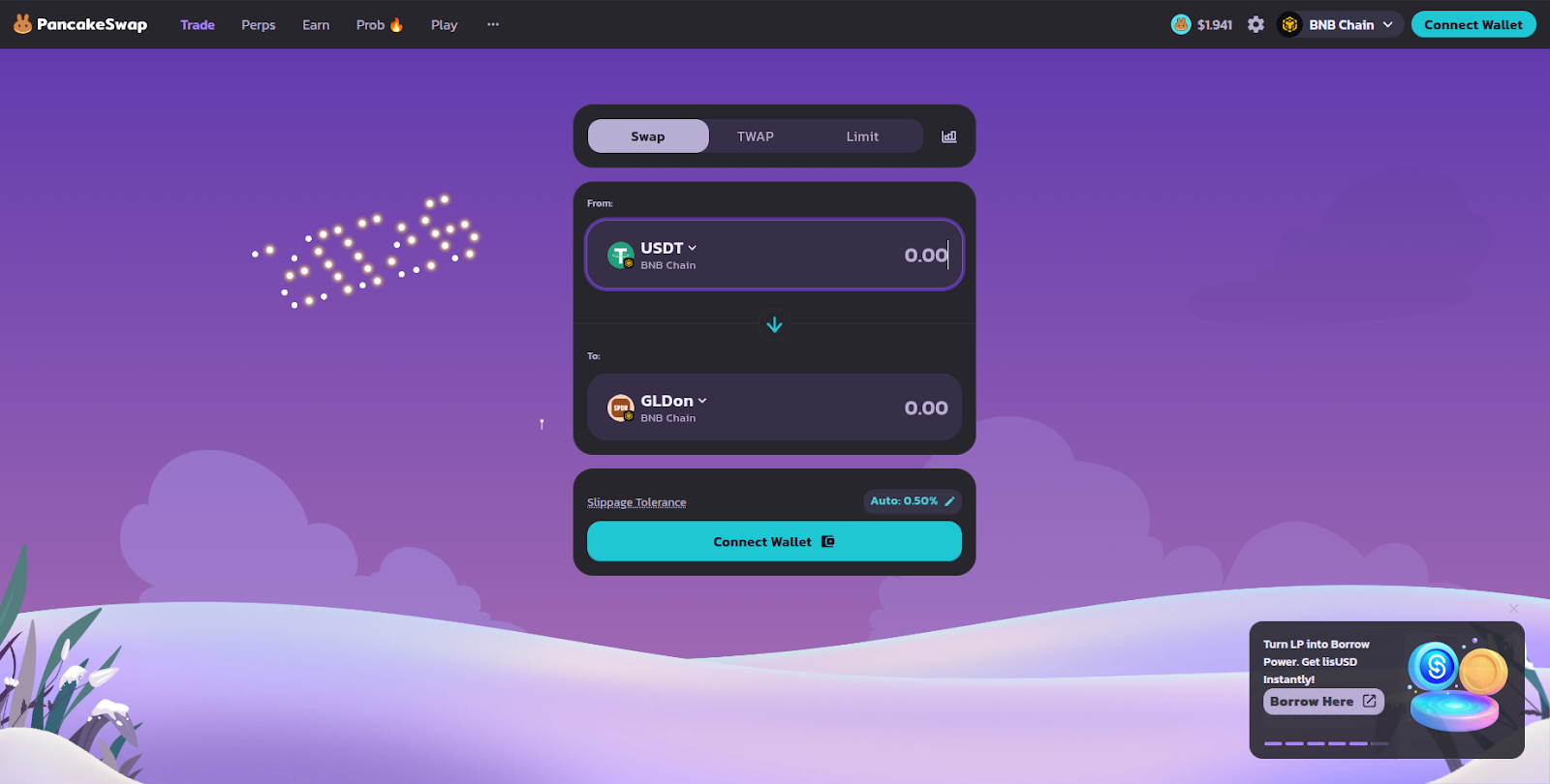 First, click on the PancakeSwap option on the Ondo Assets page or visit the PancakeSwap dApp then click ‘Connect Wallet’.