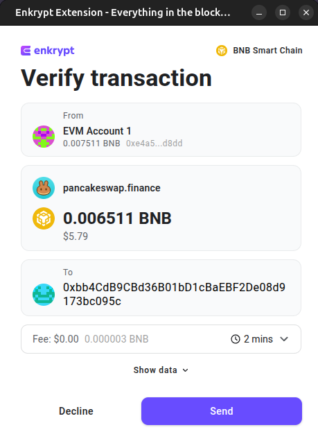 On the Enkrypt pop up, confirm the swap by clicking the ‘Send’ button. Once the transaction is confirmed, you will receive your tokens in your Enkrypt wallet.