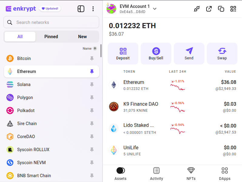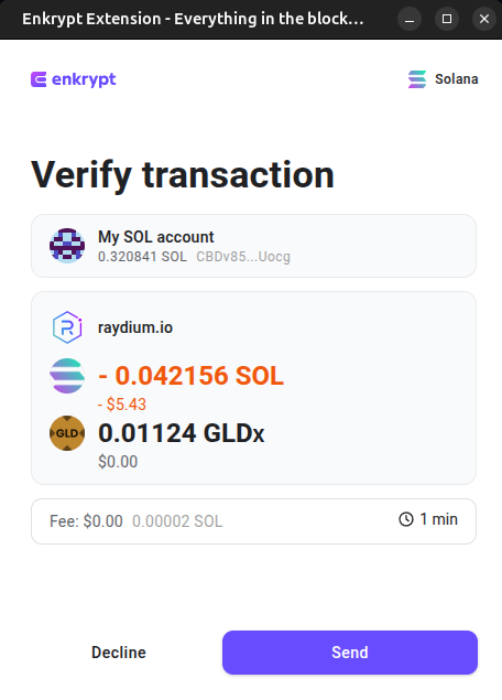 To confirm the swap, click ‘Send’ on the Enkrypt pop up. Once the transaction is confirmed on the blockchain, you should receive your tokens in your Enkrypt wallet.