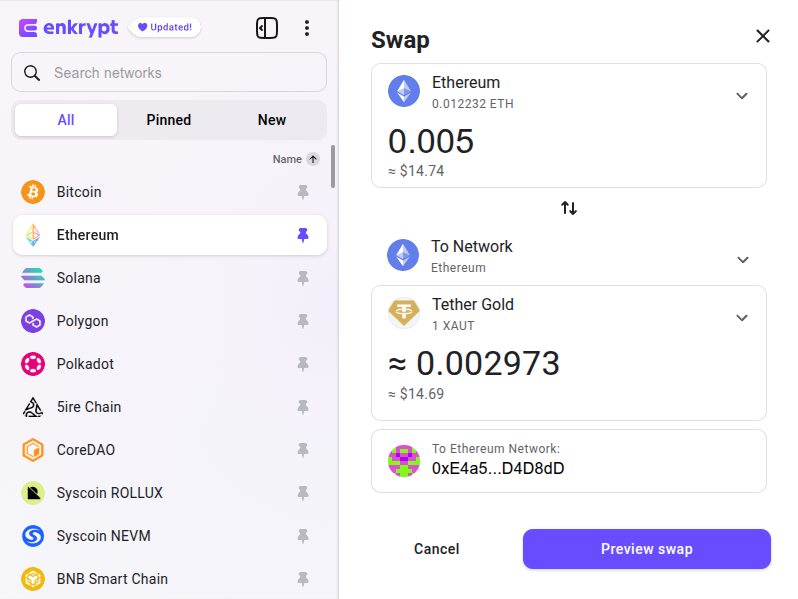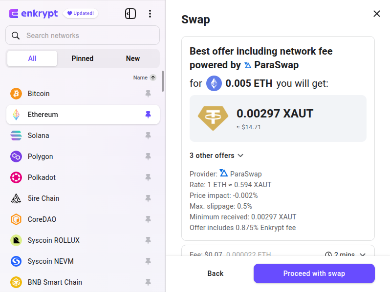 Review your swap then click ‘Proceed with swap’. Once the swap is complete, you will receive the Tether Gold tokens in your Enkrypt wallet.