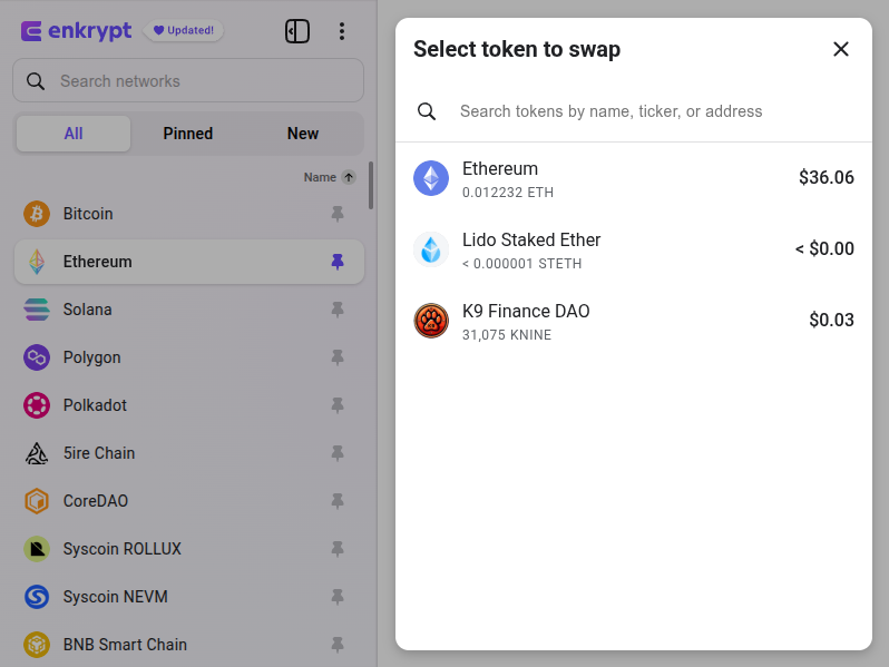 First, unlock your Enkrypt wallet then make sure you are on the Ethereum network and select the ‘Swap’ button.