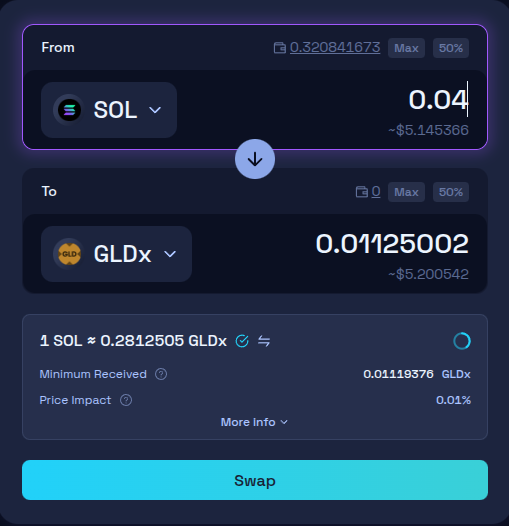 Here you can select or search for the token you want to swap to. We will search and select the SPDR Gold Shares (GLDon) token.