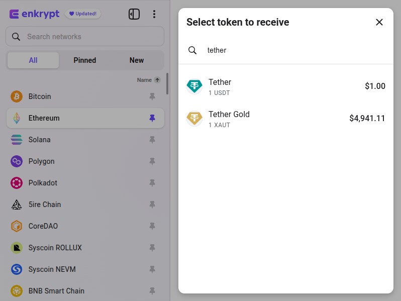 Here you can select or search for the token you want to swap to. We will search and select the Tether Gold token.