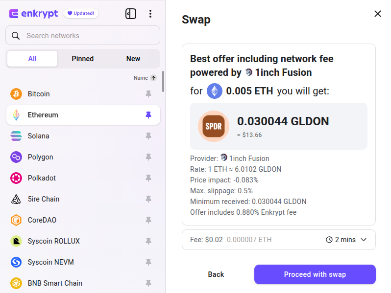 Review your swap then click ‘Proceed with swap’. Once the swap is complete, you will receive the GLDon tokens in your Enkrypt wallet.
