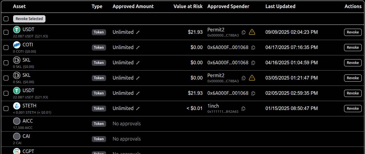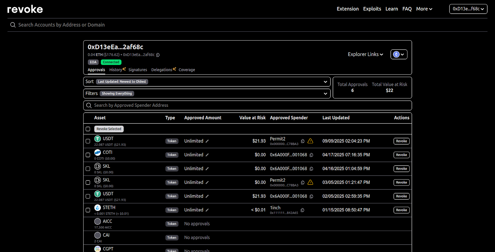On the Revoke homepage after connecting your wallet, there will be a list of tokens that have approval that will allow other accounts to spend your tokens.