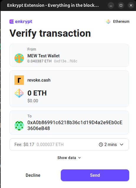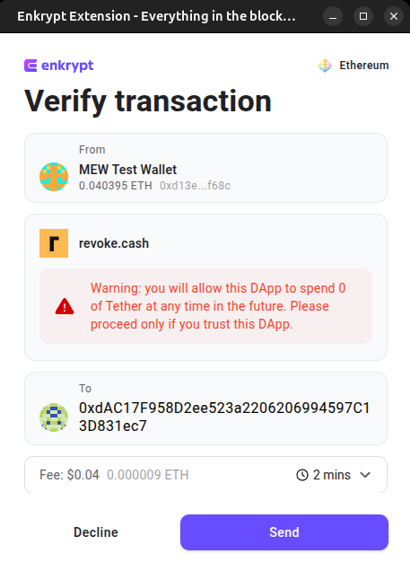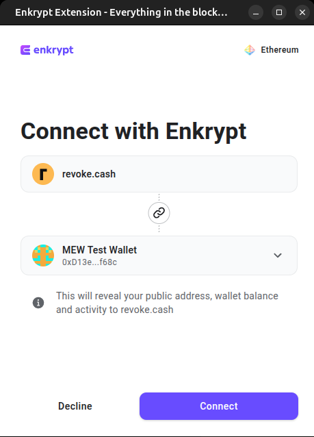 Enkrypt is a multichain, non-custodial, and open-source web3 browser wallet built by the team behind MEW (MyEtherWallet). With Enkrypt, users and developers can generate accounts, manage tokens and NFTs, and interact with DApps on Base, Ethereum, Solana, as well as Bitcoin, Substrate and any EVM chains. Follow the instructions in this guide on how to use Enkrypt with Revoke!