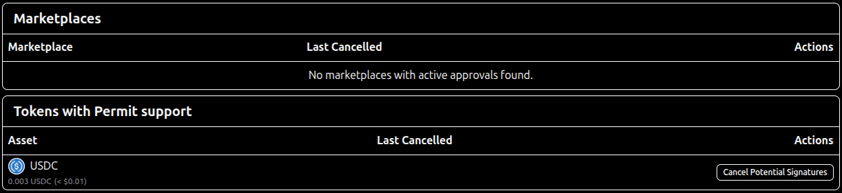 Note: Off-chain signatures let you approve actions (like marketplace listings or token approvals) without an on-chain transaction. Since they aren’t stored on the blockchain, Revoke.cash can’t detect them automatically. You only need to cancel these signatures if you suspect you signed one on a scam site—otherwise you’ll just waste gas.