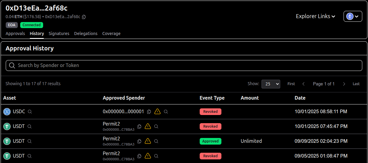 Here you can see all of the token approval transactions and we can confirm that our token approval was successfully revoked.