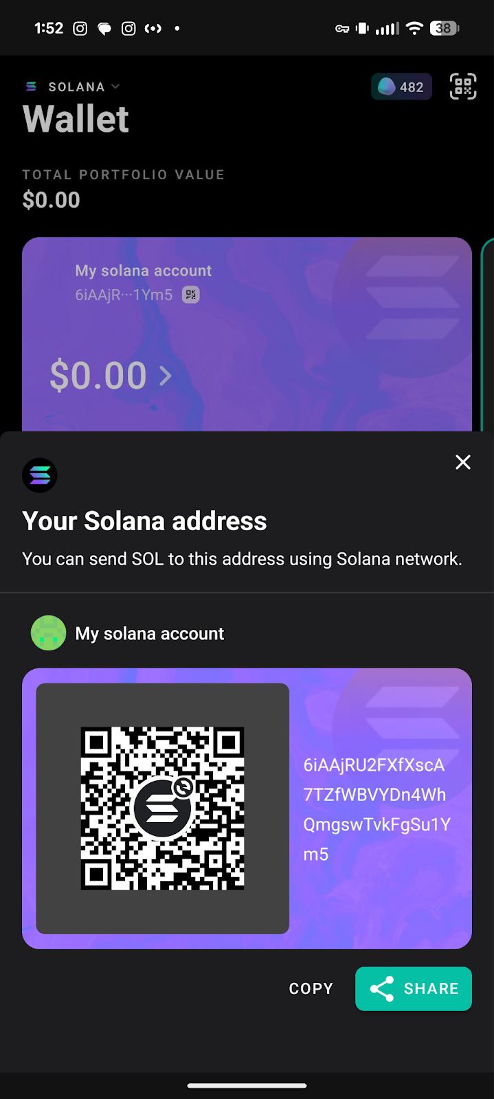 Here you can click on the copy button to copy your wallet address. Send your address to your PC so you can paste it into Enkrypt.