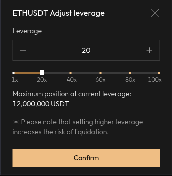 You can enter the number or move the slider to the amount you want to set as your leverage. We will leave it on 20x leverage for this example. You can also increase your leverage to 1001x using the ‘degen mode’ but this is very risky and should only be used by experts at perpetuals trading.