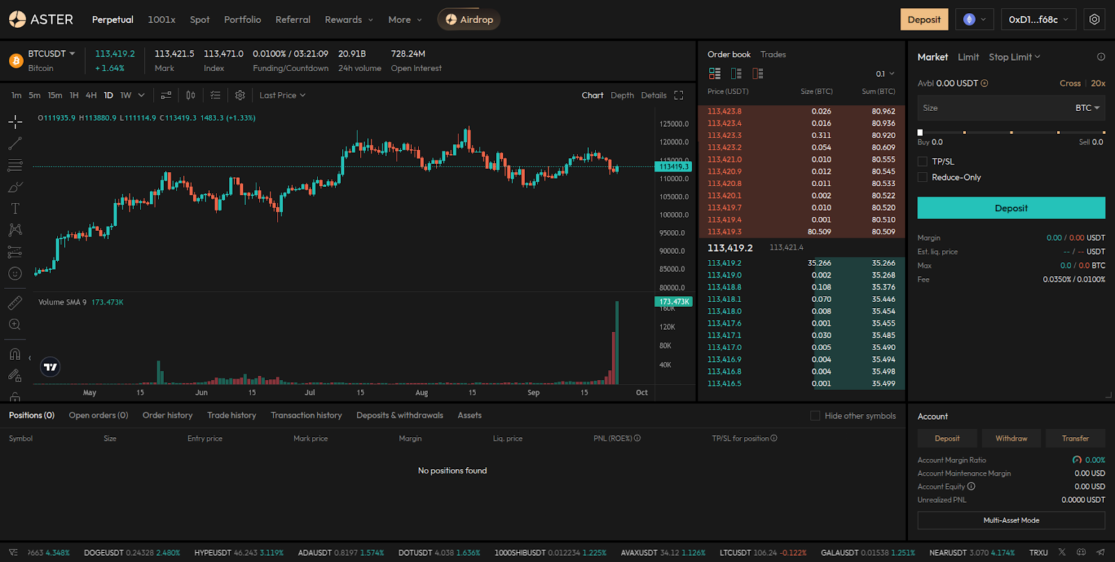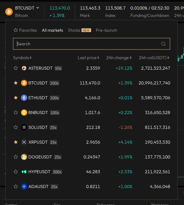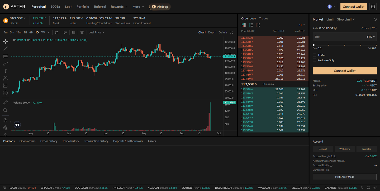 Aster supports both perpetual and spot trading. Spot trading is the direct purchase or sale of an asset for immediate settlement at the current market price. Perpetuals trading uses derivative contracts that track the asset’s price without an expiry date, allowing traders to use leverage and speculate on price movements without owning the asset itself.