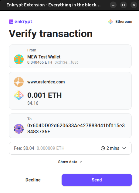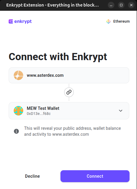 Enkrypt is a multichain, non-custodial, and open-source web3 browser wallet built by the team behind MEW (MyEtherWallet). With Enkrypt, users and developers can generate accounts, manage tokens and NFTs, and interact with DApps on Base, Ethereum, Solana, as well as Bitcoin, Substrate and any EVM chains. Follow the instructions in this guide on how to use Enkrypt with Aster!