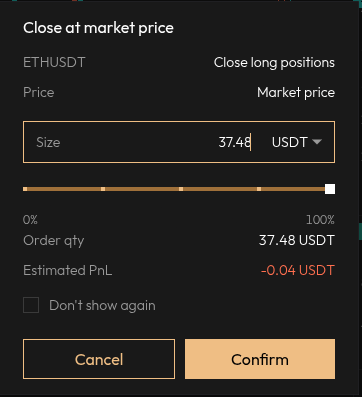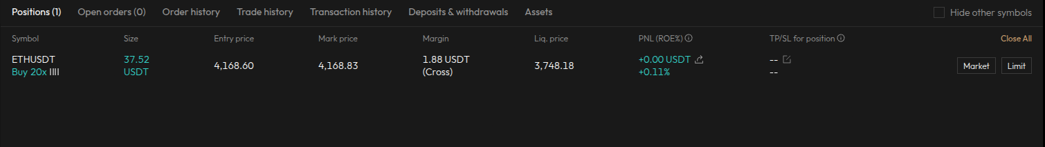 Scroll down to ‘Positions’ underneath the chart. You can choose between ‘Market’ or ‘Limit’ for selling your position.