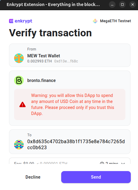Next, we will need to approve the dApp to use our USDC tokens. Confirm the transaction on the Enkrypt pop up by clicking ‘Send’.