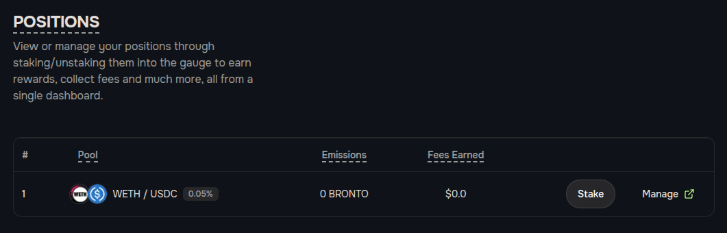 Here you can view your positions and manage your position by clicking ‘Manage’. We will click ‘Manage’ on the WETH/USDC pool.