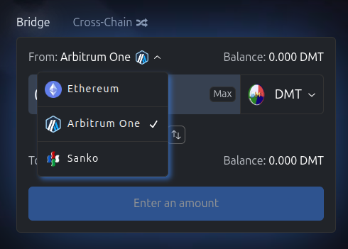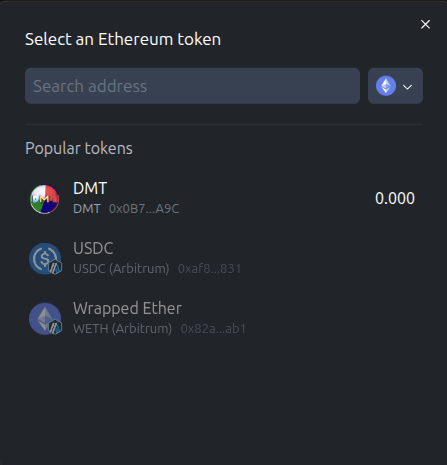 You can click the token dropdown to open the token menu. We will leave it on the DMT token for this example.
