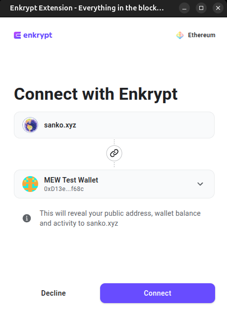 Enkrypt is a multichain, non-custodial, and open-source web3 browser wallet built by the team behind MEW (MyEtherWallet). With Enkrypt, users and developers can generate accounts, manage tokens and NFTs, and interact with DApps on Sanko, as well as Solana, Bitcoin, Substrate and EVM chains. Follow the instructions in this guide in order to use Sanko on Enkrypt!