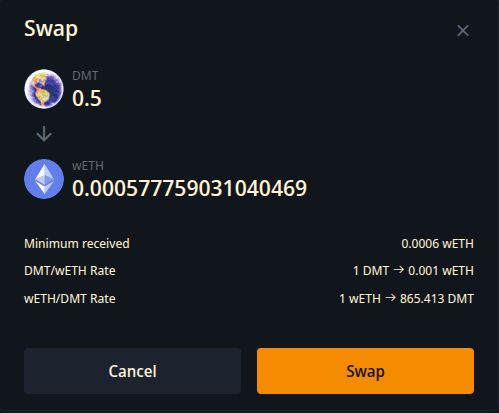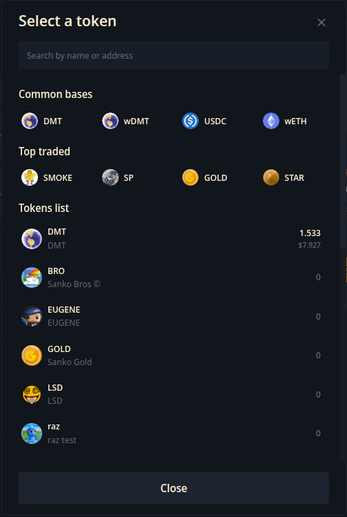 Select the token you want to swap. We will choose the DMT token for this example.