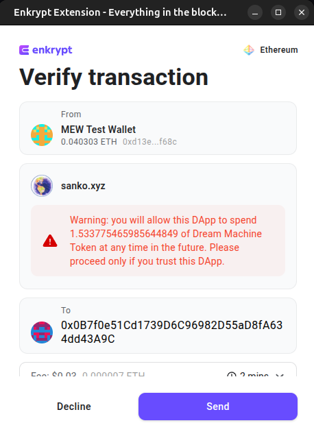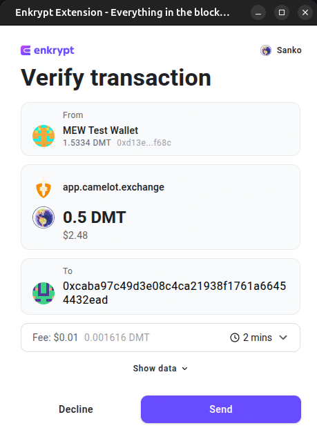 On the Enkrypt pop up, click ‘Send’ to confirm the transaction.