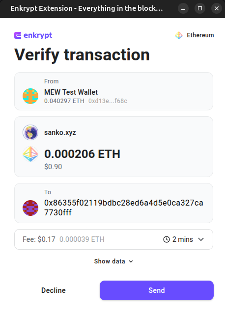 On the Enkrypt pop up, confirm the transaction by clicking ‘Send’.