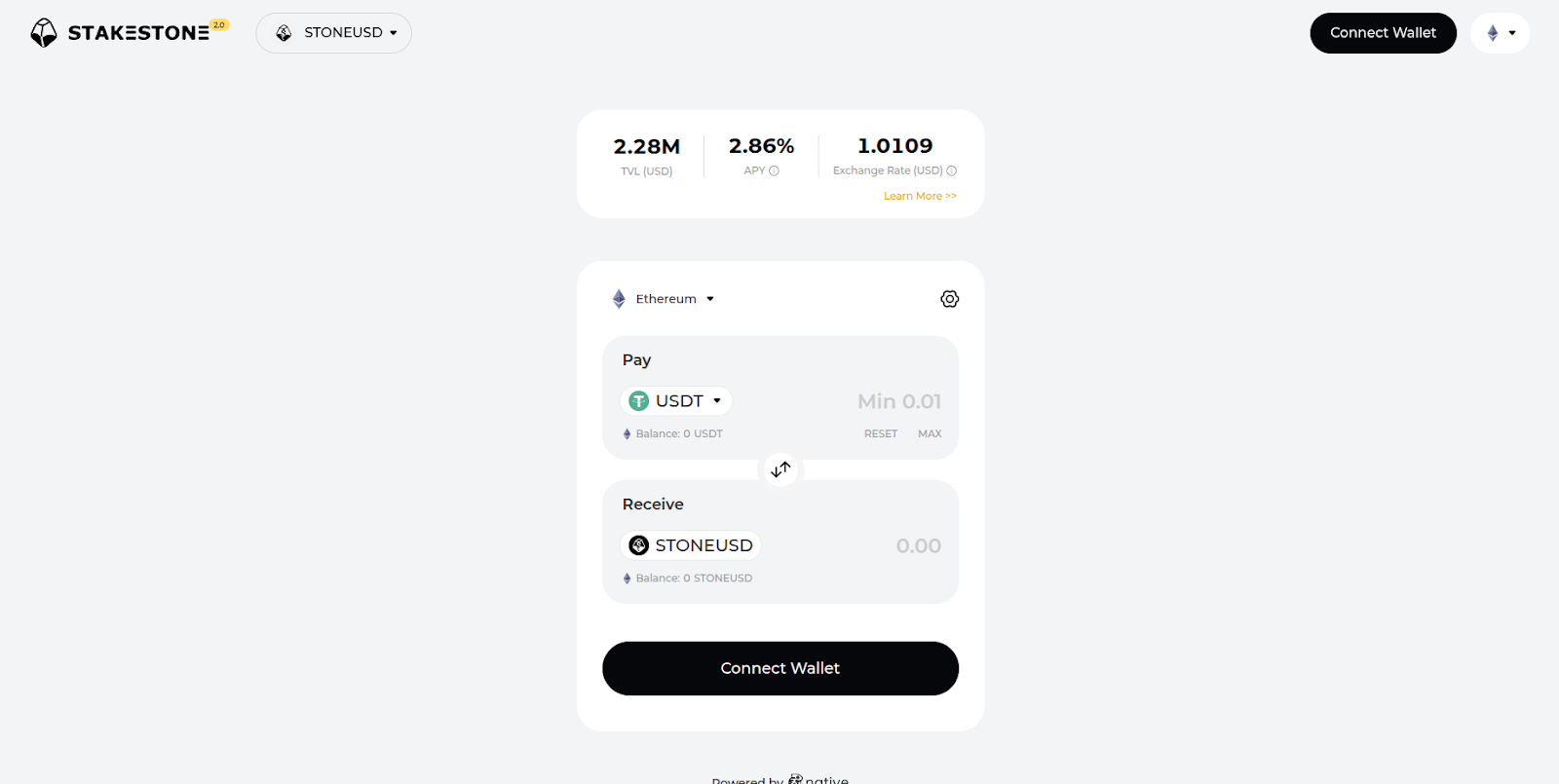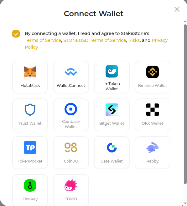 First, head to the StakeStone website then click ‘Connect Wallet’ at the top right.