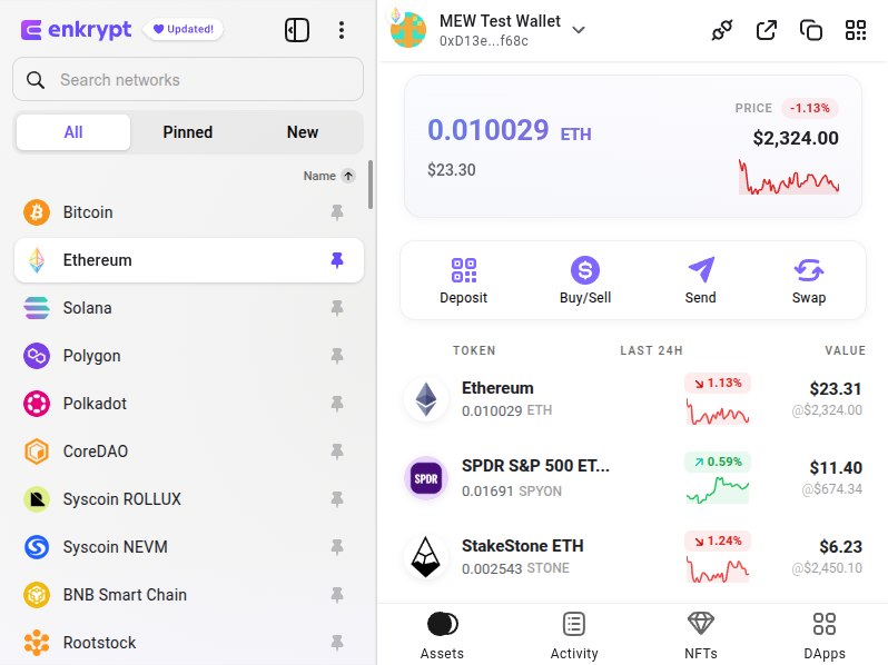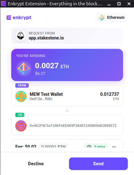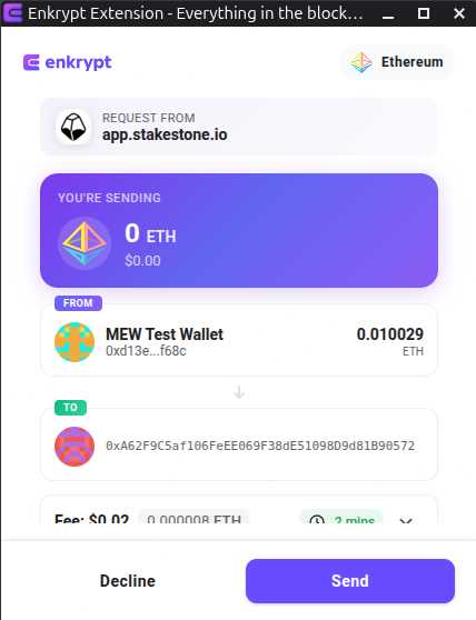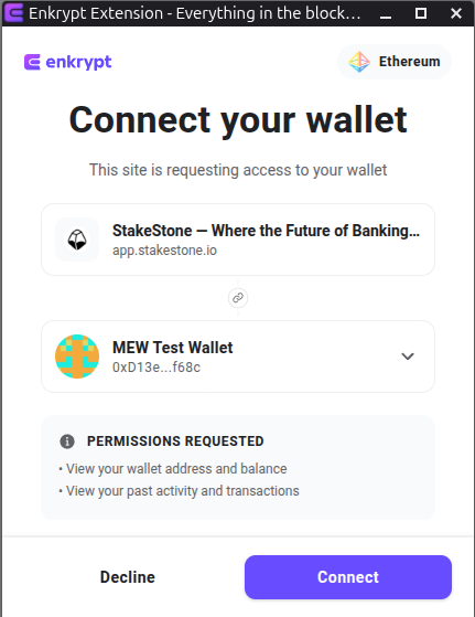 Enkrypt is a multichain, non-custodial, and open-source web3 browser wallet built by the team behind MEW (MyEtherWallet). With Enkrypt, users and developers can generate accounts, manage tokens and NFTs, and interact with DApps on Ethereum, Solana, as well as Bitcoin, Substrate and any EVM chains. Follow the instructions in this guide on how to use Enkrypt with StakeStone!