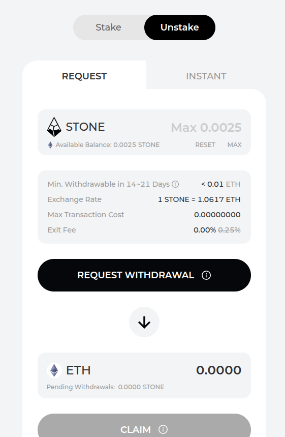 Select the ‘Unstake’ option then select ‘Request’ or ‘Instant’. The Request option will take 14 to 21 days to withdraw your full amount of ETH from staking and if you choose Instant you will receive your ETH instantly but will have a lower exchange rate.