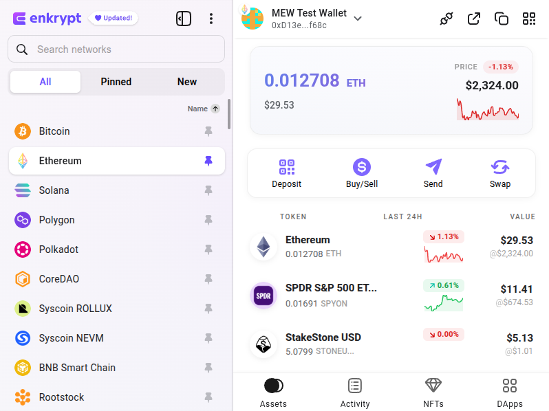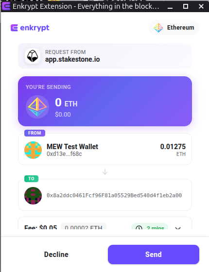 Enkrypt is a multichain, non-custodial, and open-source web3 browser wallet built by the team behind MEW (MyEtherWallet). With Enkrypt, users and developers can generate accounts, manage tokens and NFTs, and interact with DApps on Ethereum, Solana, as well as Bitcoin, Substrate and any EVM chains. Follow the instructions in this guide on how to use Enkrypt with StakeStone!