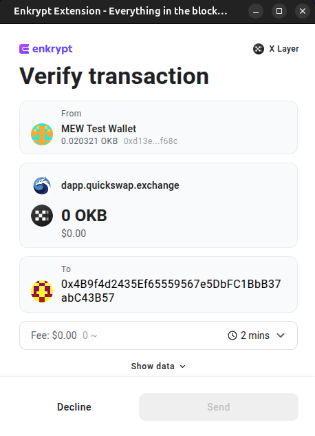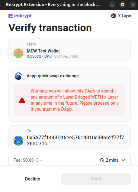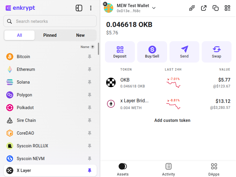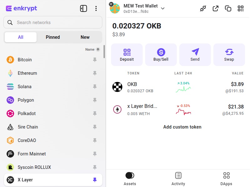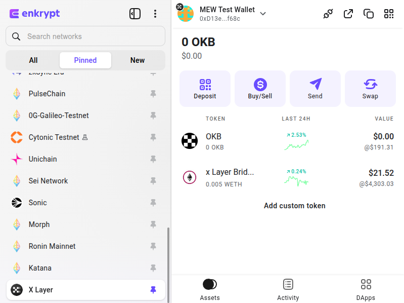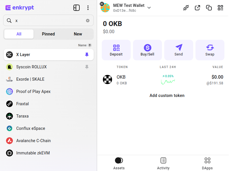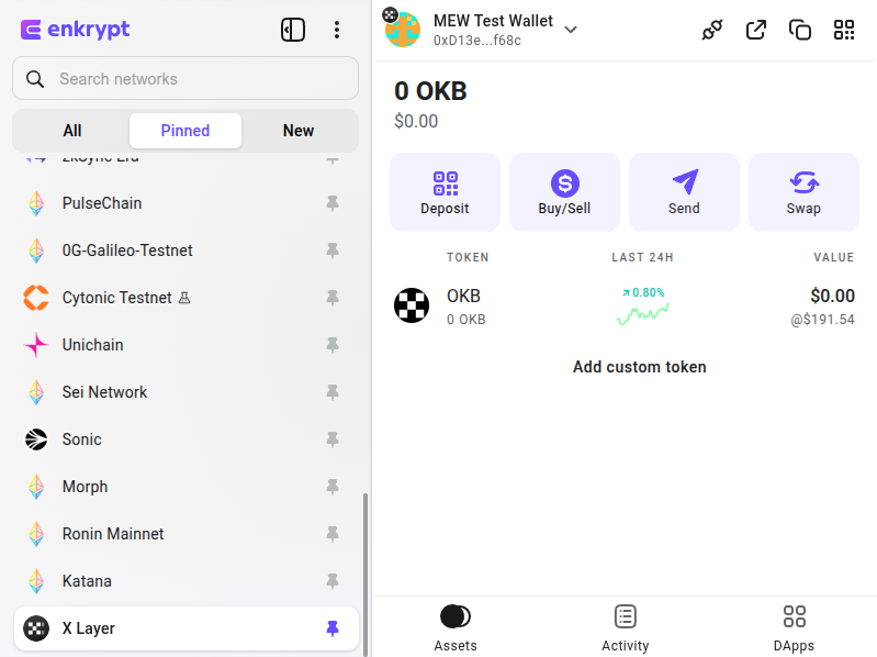 Enkrypt is a multichain, non-custodial, and open-source web3 browser wallet built by the team behind MEW (MyEtherWallet). With Enkrypt, users and developers can generate accounts, manage tokens and NFTs, and interact with DApps on X Layer, as well as Solana, Bitcoin, Substrate and EVM chains. Follow the instructions in this guide in order to use X Layer on Enkrypt!