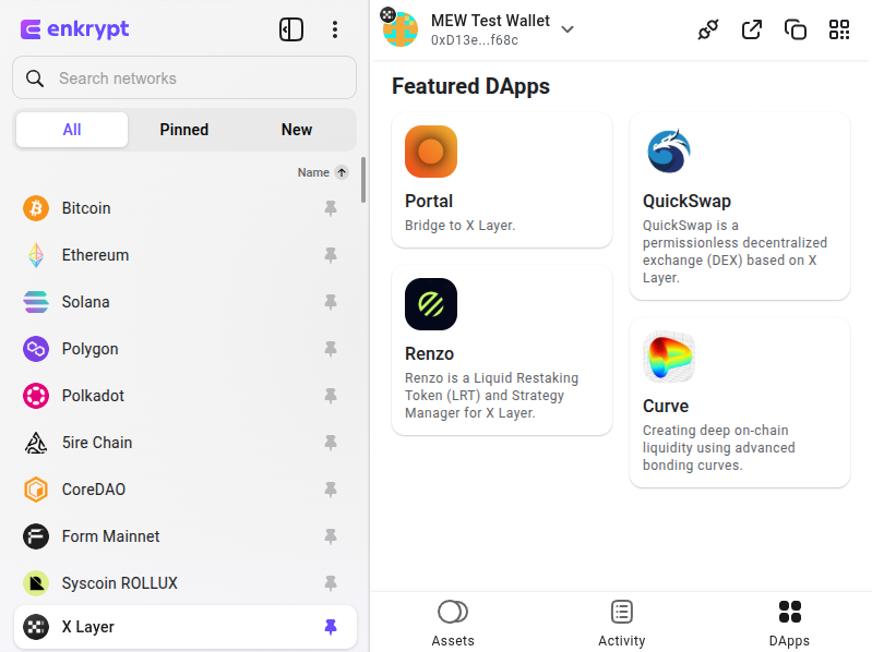 First, make sure you are on the X Layer network on the left hand menu then click ‘DApps’ at the bottom right of the Enkrypt wallet.