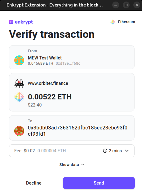 Orbiter Finance is a third-party DApp and is not affiliated with MEW in any way. Bridging assets from network to network involves some inherent risk. Please do your research and proceed at your own discretion.