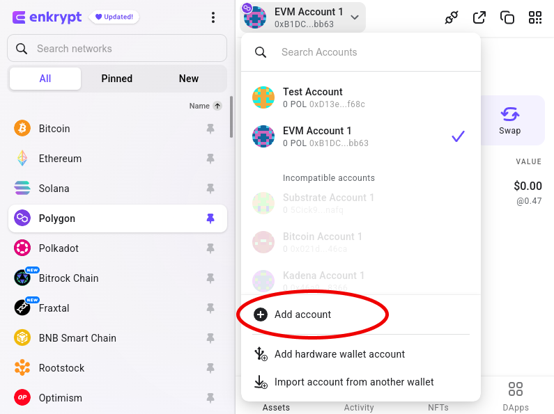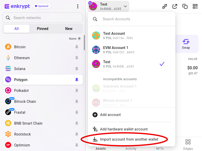 When you're done, you will see the imported account in the dropdown. It will show across all compatible networks (for example, if you imported while having Ethereum selected, you will also see it on Polygon, Optimism, Base, etc).
