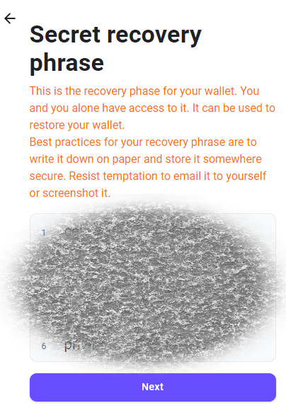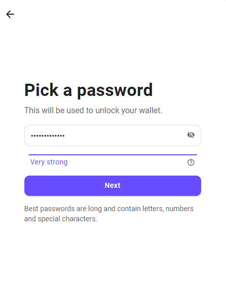 First create a password for logging into your wallet on a daily basis. This is JUST for daily access but not enough to restore your wallet in the future. After you click 'Next' you will receive your recovery phrase that you should keep secure in case you decide to use the accounts generated on this wallet and not just the account you are going to import.