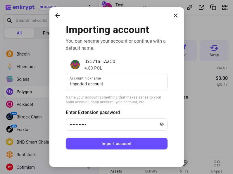Our Enkrypt browser wallet supports over 80 networks natively, plus allows you to add any EVM network as custom. All import methods are supported – via recovery (seed) phrase, keystore file, or private key. So if you’re ever in a situation where your current crypto wallet could use an assist, here’s how to import your wallet into Enkrypt with a phrase or with keystore file/private key.