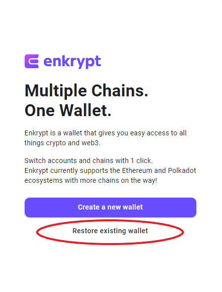 To import a wallet using your recovery phrase (also known as seed phrase, mnemonic phrase, or secret phrase), first download Enkrypt extension for your favorite browser, install, click on the Enkrypt icon in the toolbar, and then choose 'Restore existing wallet'.
